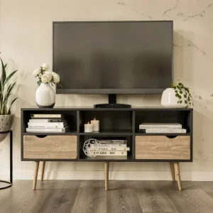 - PRATIQUE : Ce meuble de salon dispose de passe-câbles à l’arrière pour raccorder les fils discrètement. Le meuble est livré avec un kit de fixation mural pour éviter qu’il bascule en avant.